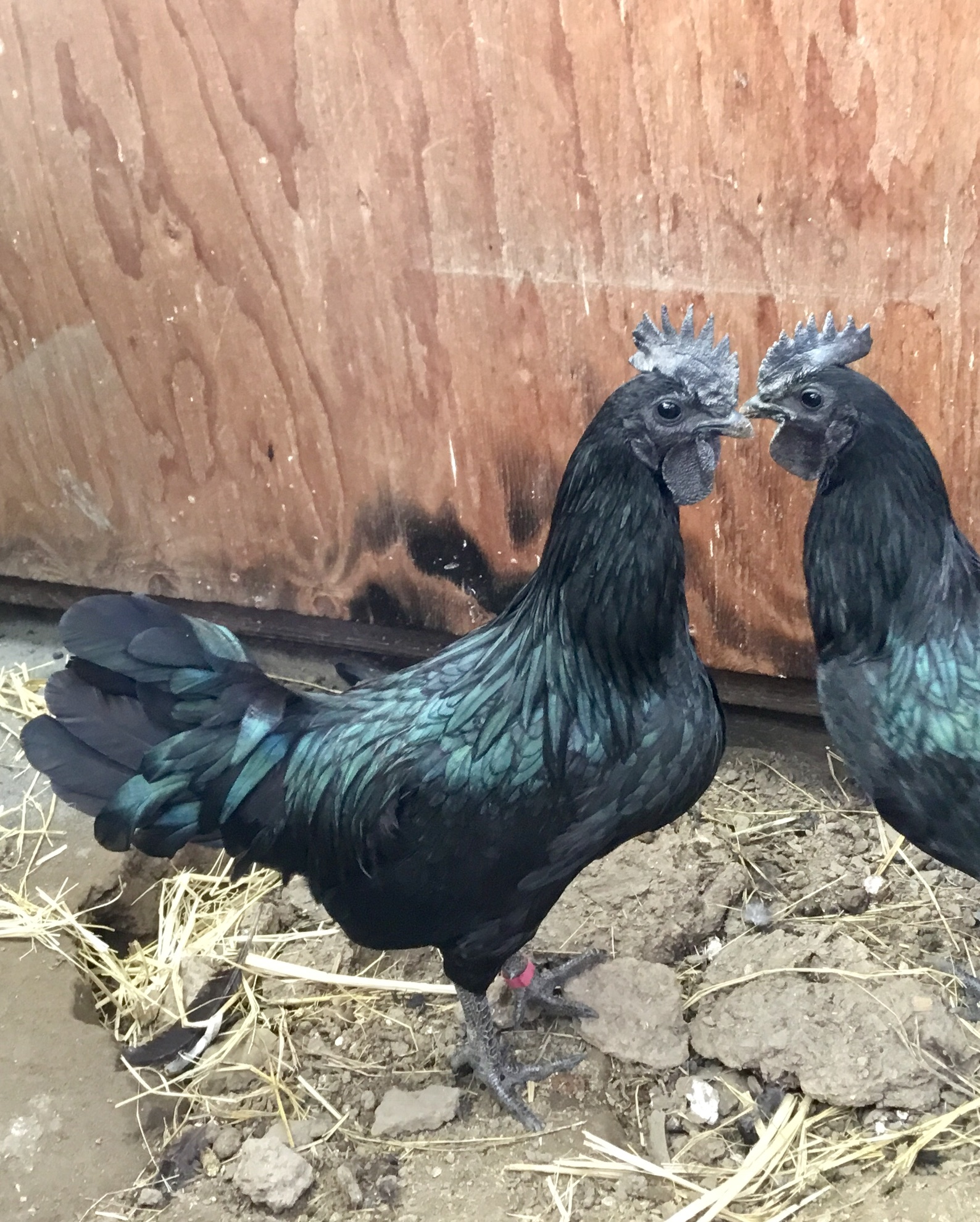 Compare these to Svart Hona Breed, (which also we raise). The Svart Hona is almost indistinguishable from the Ayam Cemani (from which it is believed Svart Hona were bred). It is considered a more cold hardy breed since it was developed in Sweden over many many generations. But otherwise it is very hard if not impossible to tell the breeds apart from each other. (Go to Svart Hona Catagory to see them.)