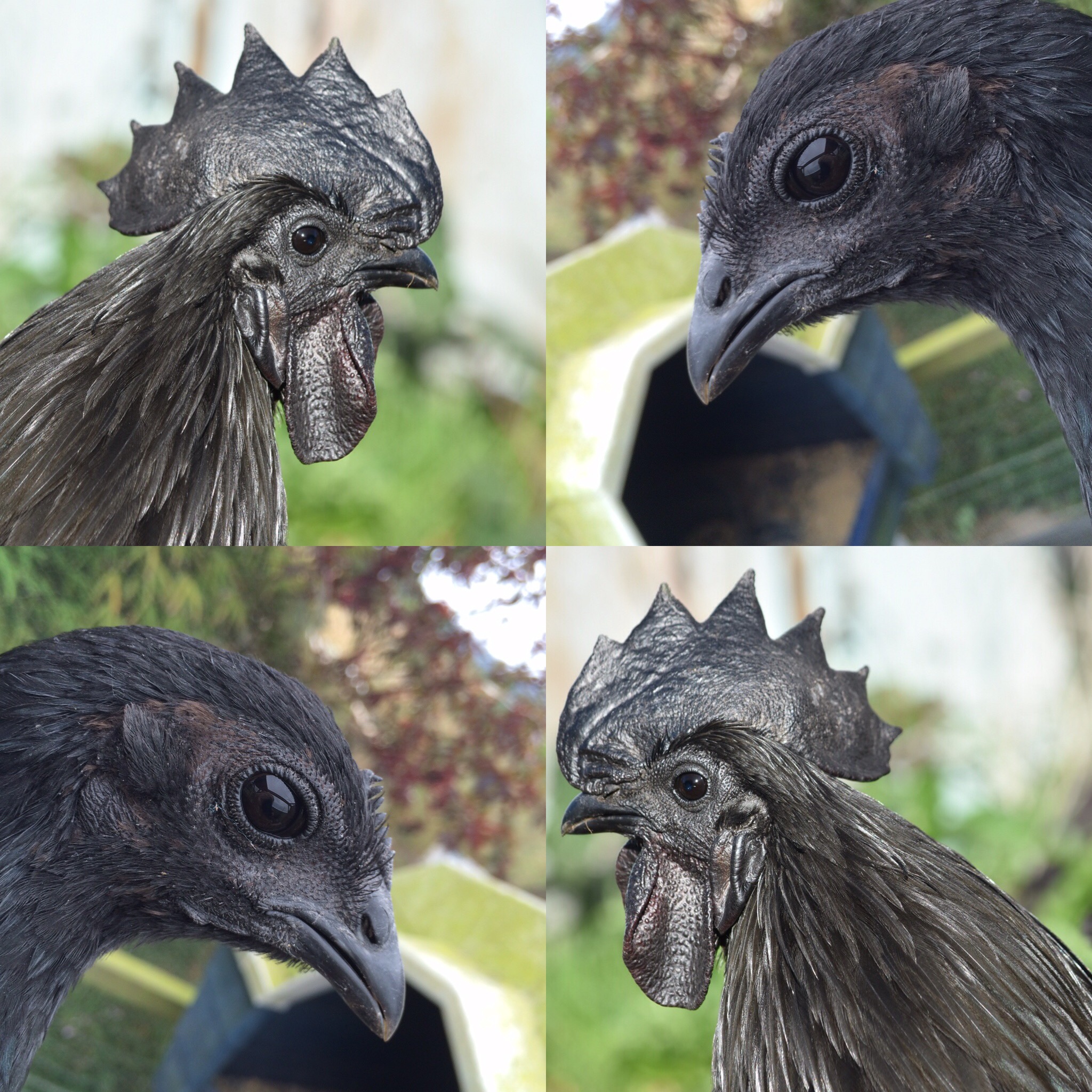 Well that’s Ayam Cemani for you. An all black bird all through – even the bones are black. A precious and sacred chicken it be. We occasionally offer these Ayam Cemani. This rare breed is highly sought after, so we often sell out locally. We offer chicks (Locally only!!) of this breed. I shall list adults for shipping when we haven’t sold out locally…(or by special request with deposit).