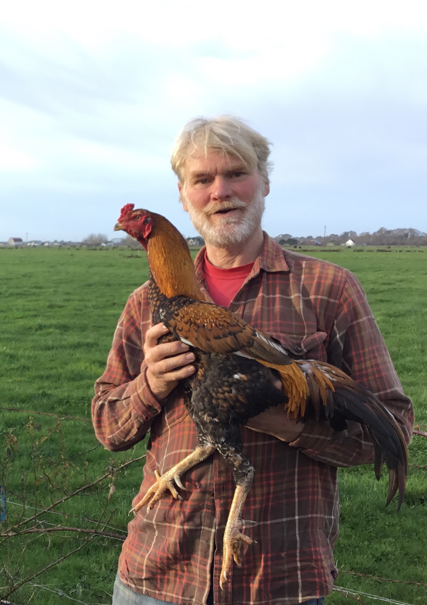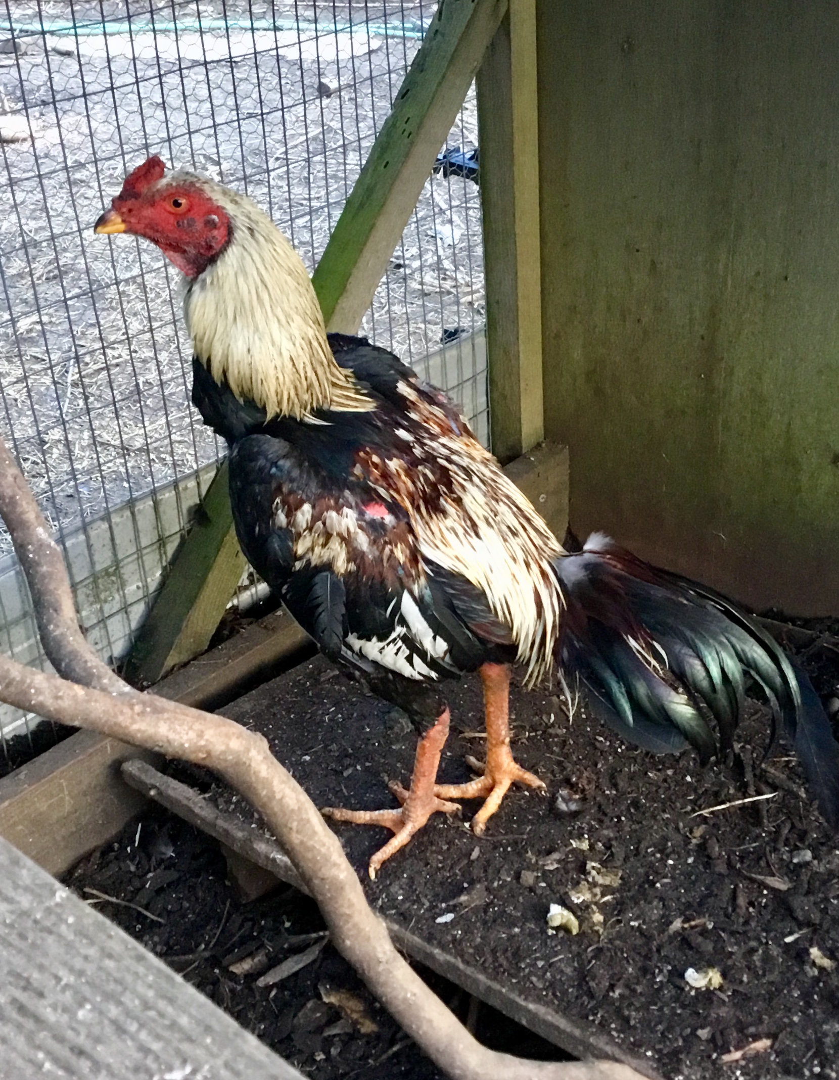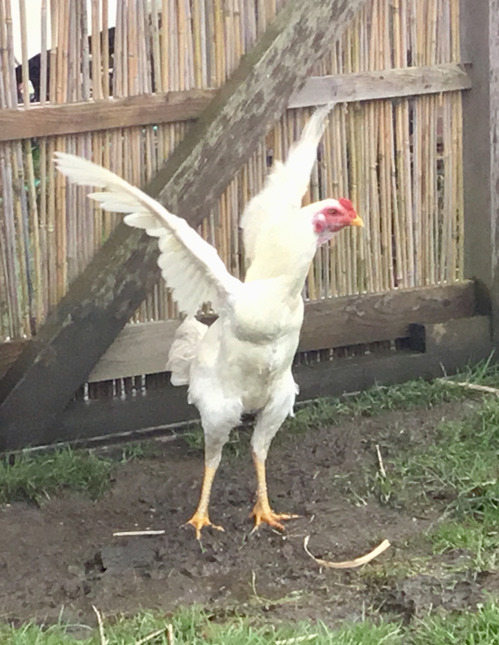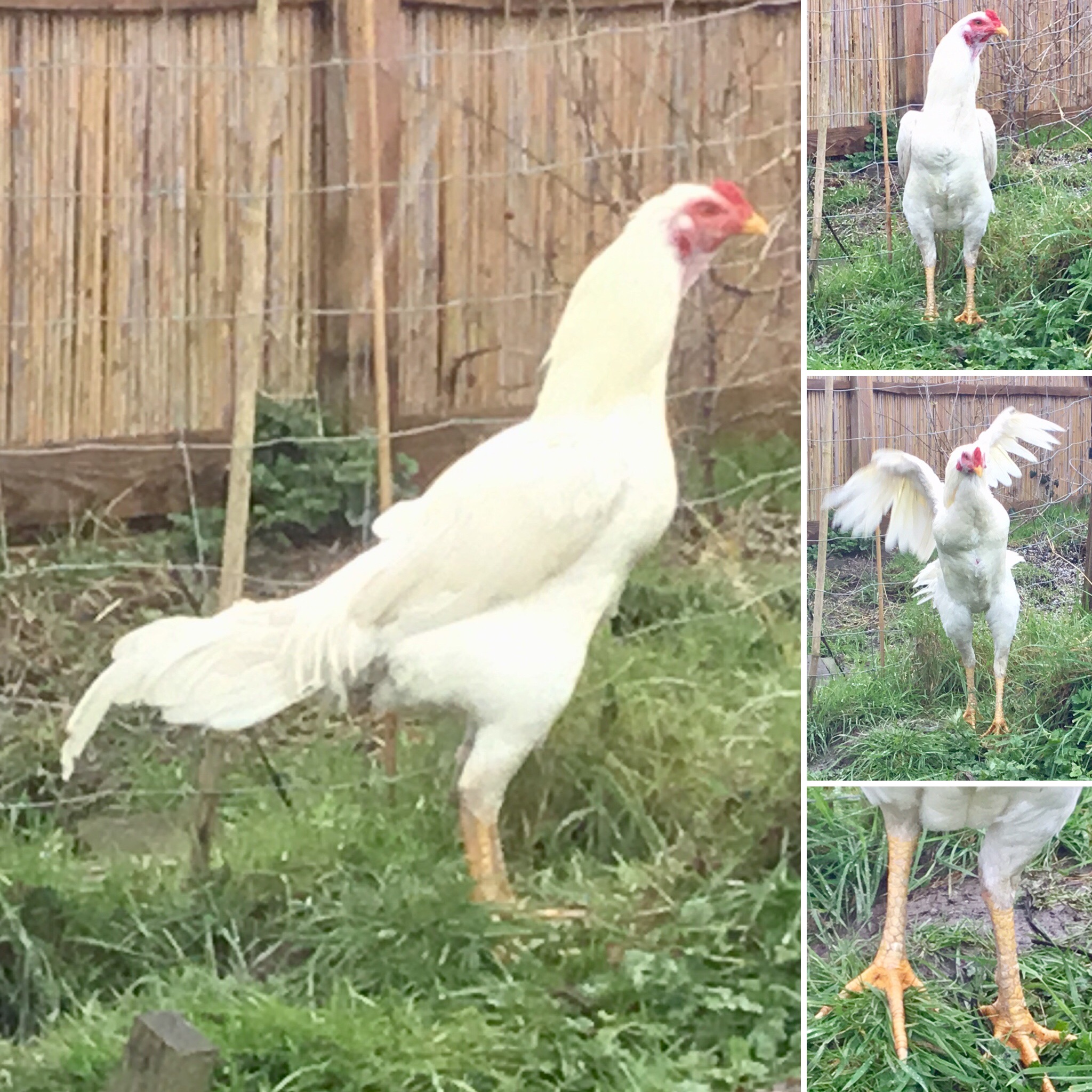NQL sired the white rooster shown before him (when put over Cricket, a blond Thai).