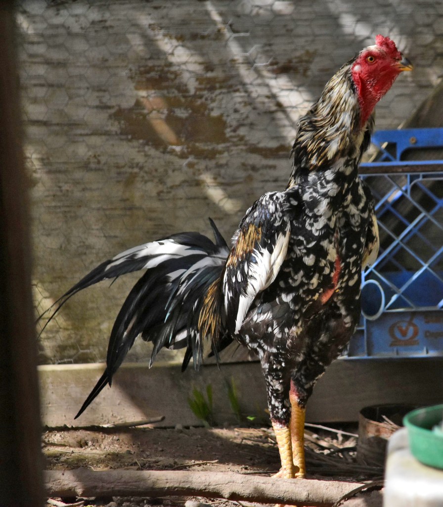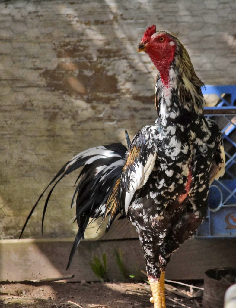 This 2nd year adult GaNoi Rooster born Spring of 24. (2 years old in April ’26) Photos are taken 5th of January 2026. More UPDATED photos by email, …………His weight: He’s 9 pounds 8 ounces as of early January. 9 1/2#. Solid Stout Boi. Full on GaNoi of Stout Wheaton Mom and Strong White Dragon (which carries hidden Black genes). He is uncle of similar colored cockerel listed above. Interesting full broad tail with slightly curved feathers. Note he has a nasty wart on palm of foot – it’s being treated but ain’t gone yet. “Berndt” is especially friendly, unusually mellow, and enjoys human company. His soul differs markedly from his 5 brood brothers and most birds. His difference was apparent very early on. His personality stood out. He’s not a usual bird. He was always interested in what I am doing, and liked being near, curious. Very chill, hangs out. Very personable. Likable. He must be a gay cock. He’s prime “Pet” material/candidate for a more intimate relationship for that reason. Despite his good heritage, and his very decent carriage, nevertheless I doubt I would choose to breed him for game. I list him because once in a while i have a buyer who wants exactly this “personableness”. Price negotiable. If he interests you, inquire.