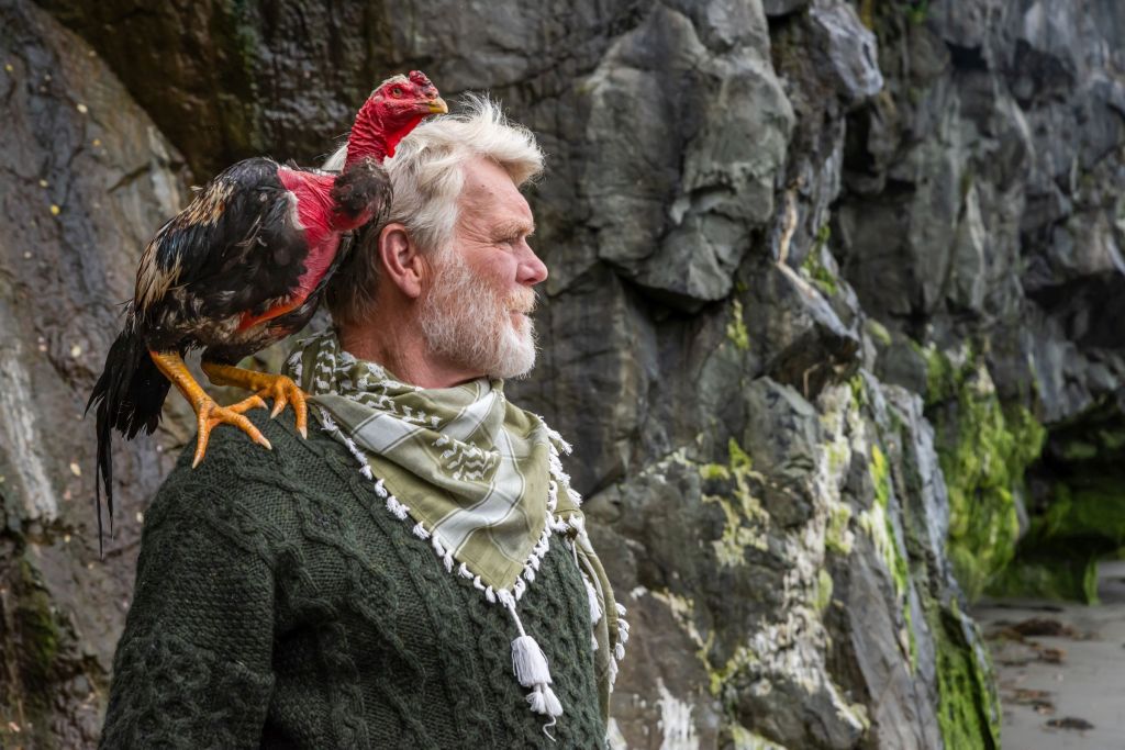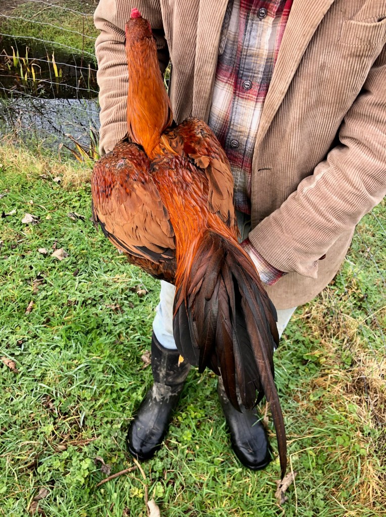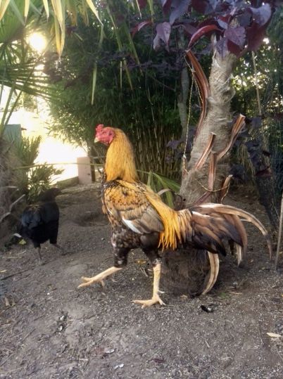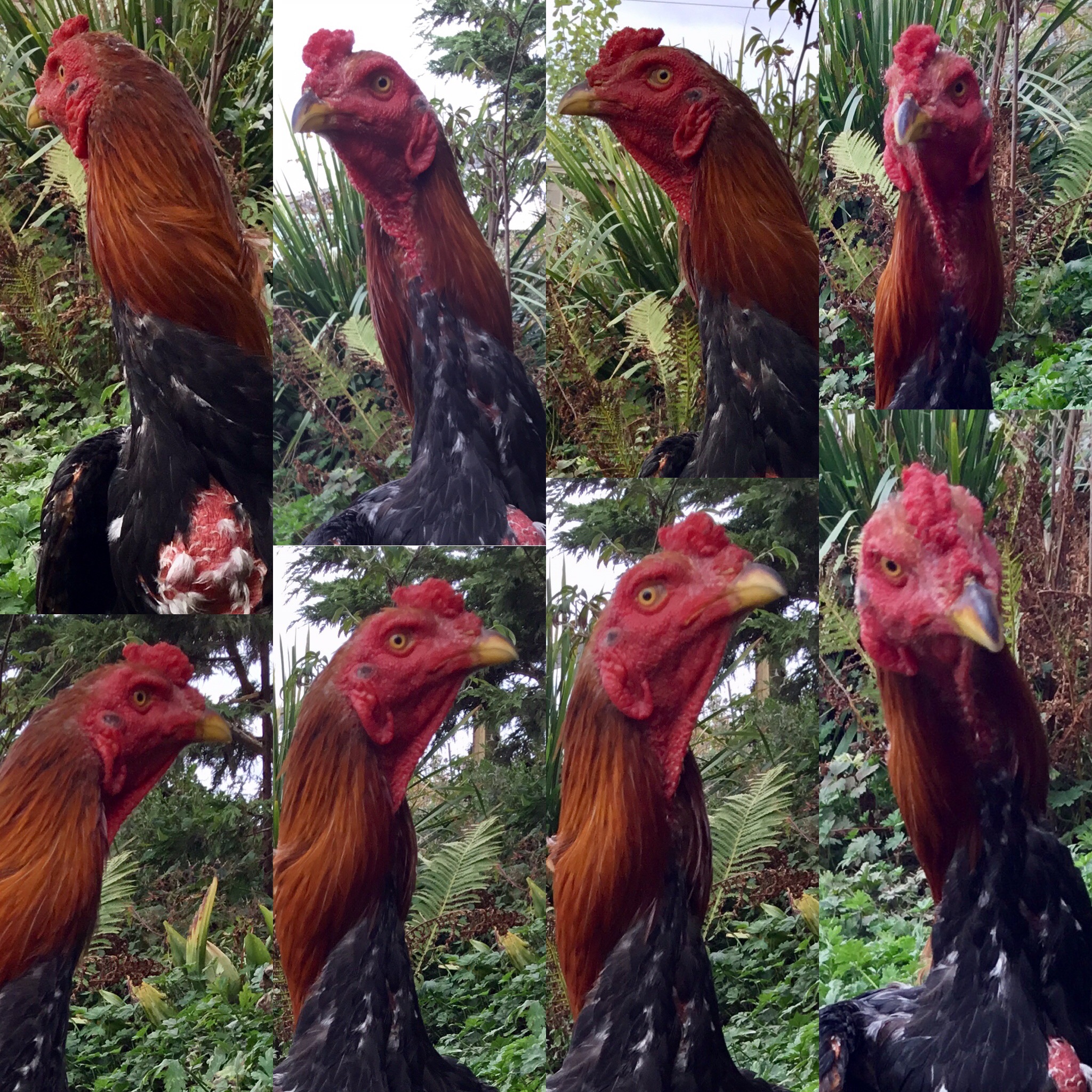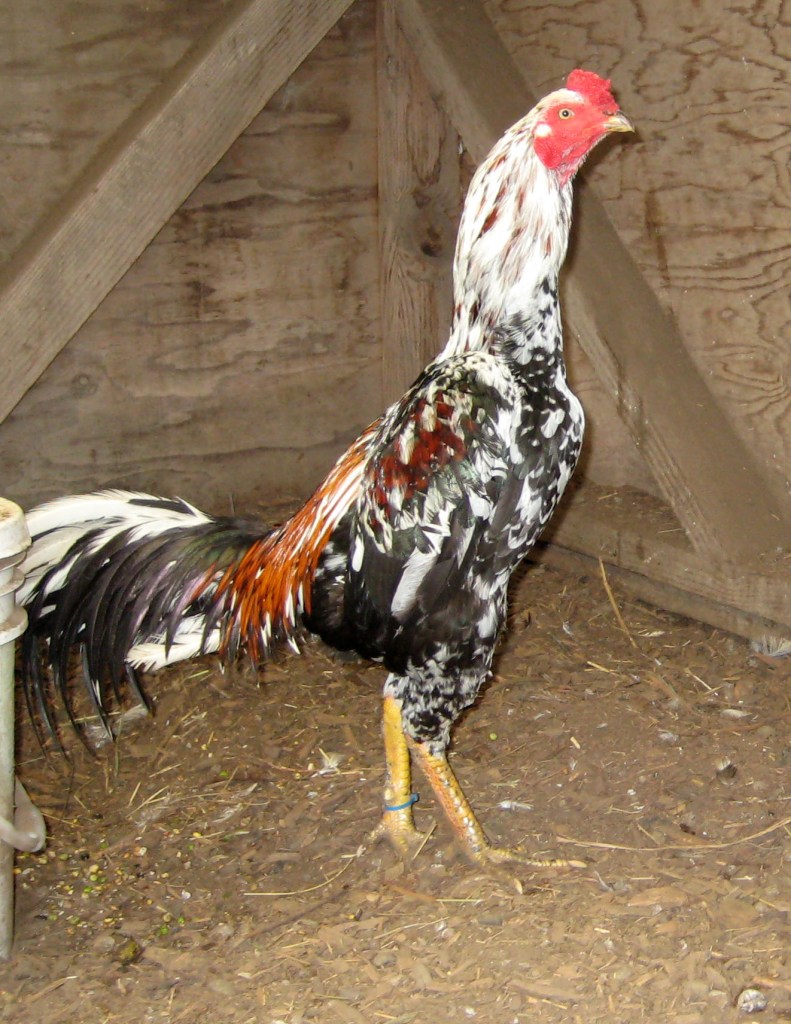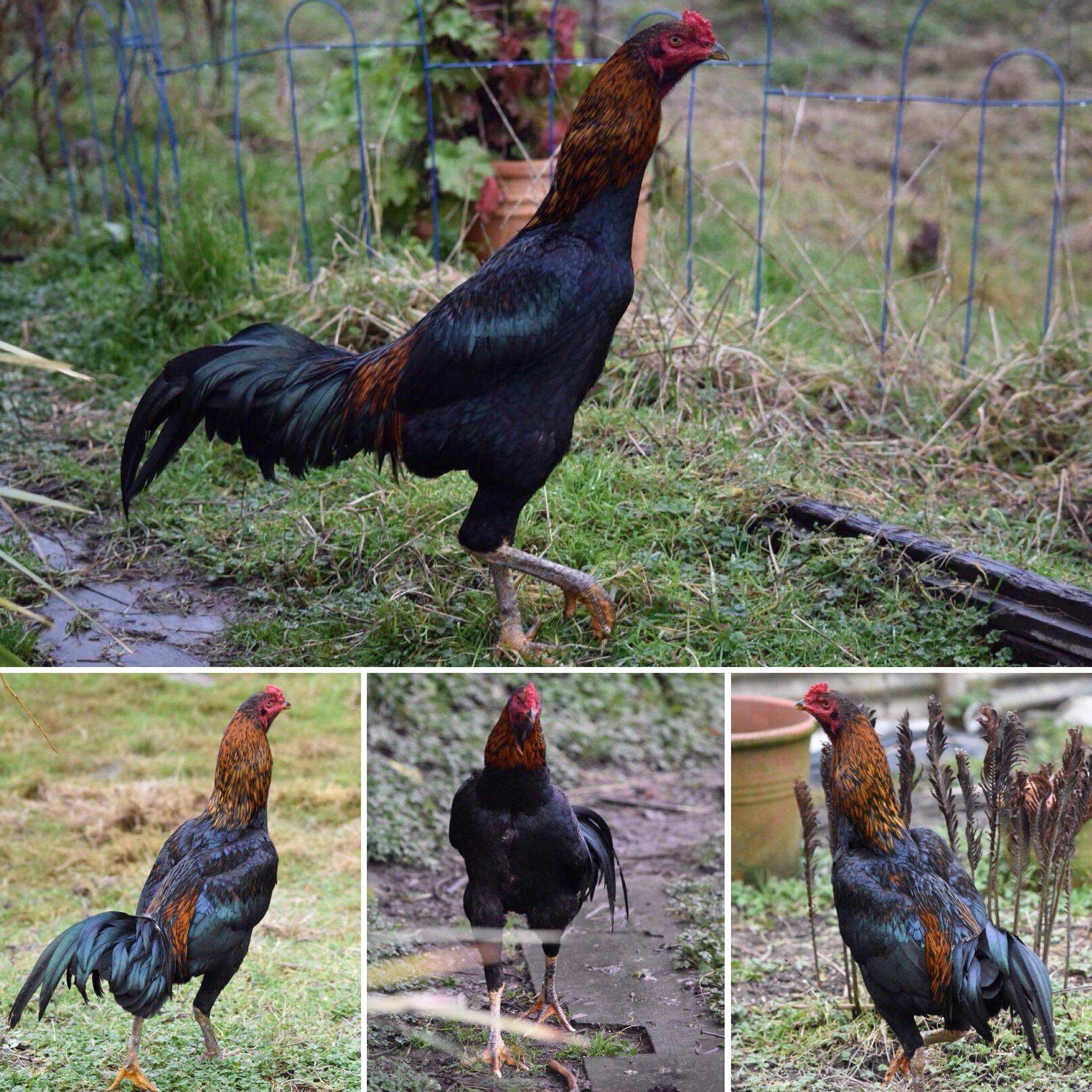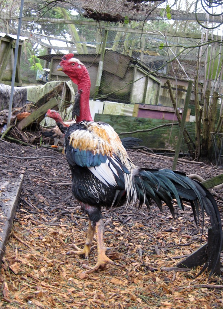 JJ jr, above two photo-blocks, a young stag, weighs 5#11oz in these pics but obviously was still growing; he had just barely started crowing. Result of Madagascar roo over large Ganoi hen (Pearl). First generation cross in my project of developing a larger strain of Madagascar as my original stock of relatively pure Mads were small).
