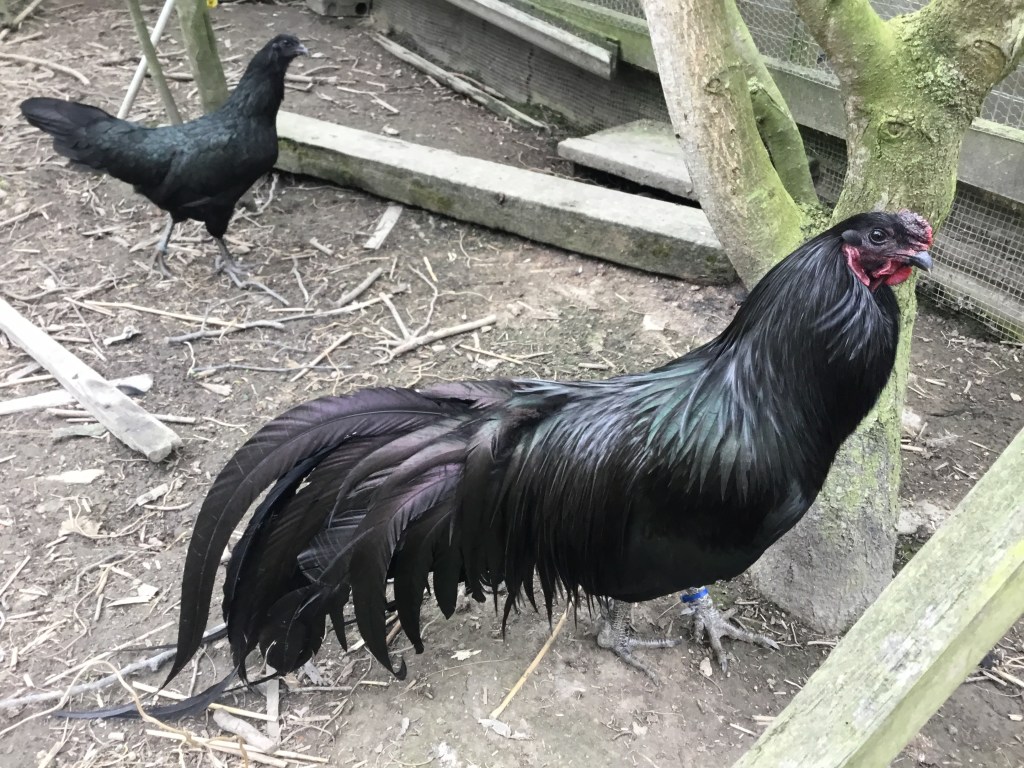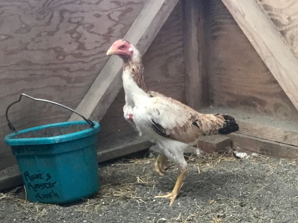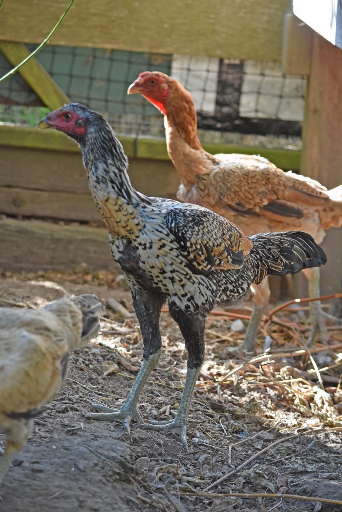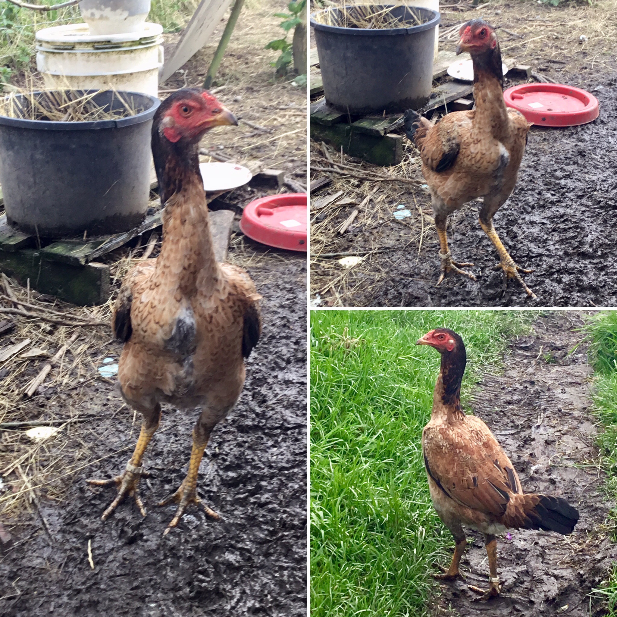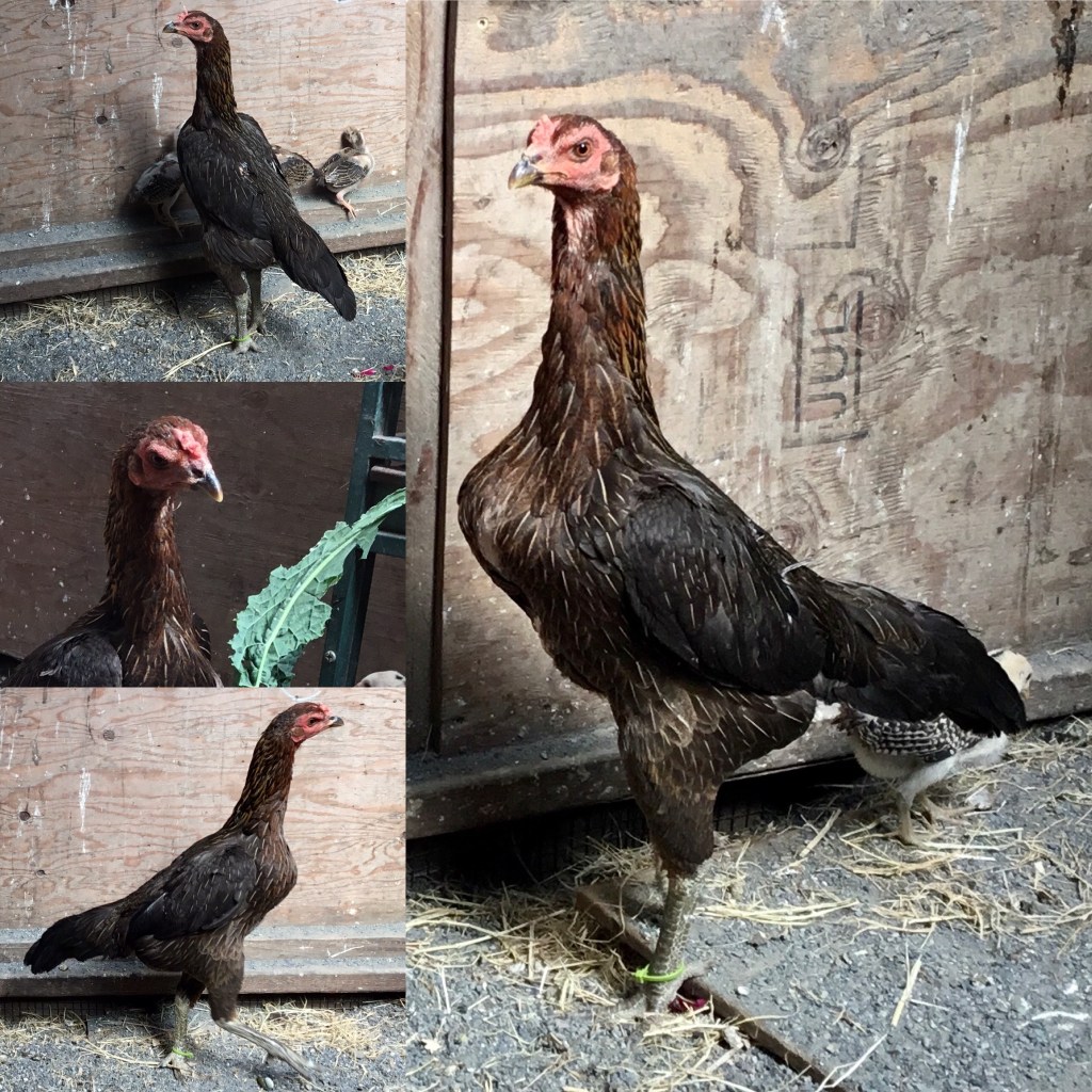 BABY Shamo. cute, but we QUIT ALL SHAMO blood in our lines.Shamo cockerel. good hips. we discontinued all Shamo influence in breeding, however.