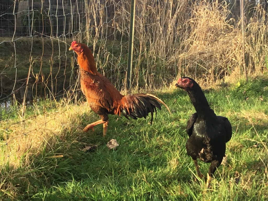 Cinnamon blue pullet on the left, ginger w green legs purple lag-band on right