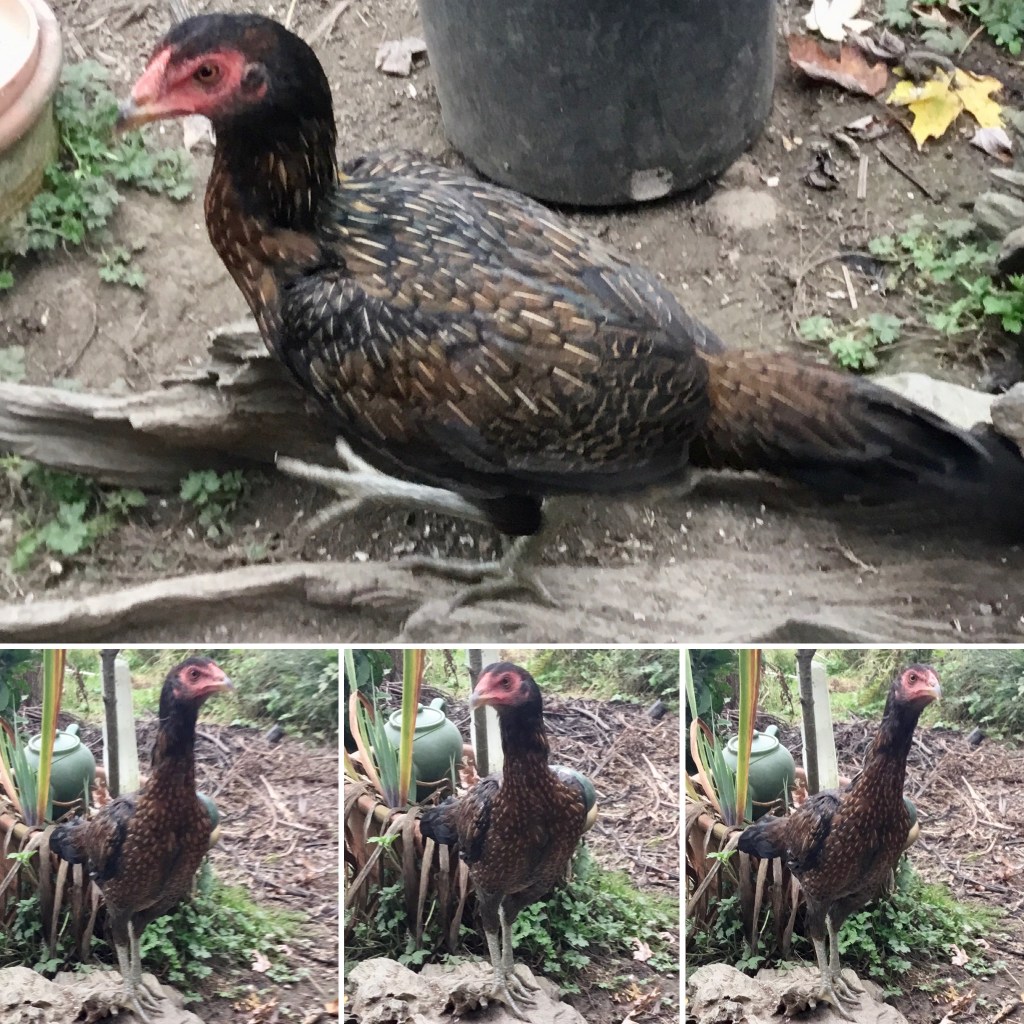 This Dark pullet ABOVE is from my Saigon Thai style tribe. typically my Saigon hens are this colour “Dark”, also “Cinnamon”, or “Ginger” basically shades of BBR – hens in partridge pattern, rather than wheaton – her sisters representing all three tones’ She never sold…she became a great bird and breeder. Named her Wodensdamm. Sister of KADIR. Truth be told our BBR and Wheaton are muddled together. We can a little careless of paintjob.