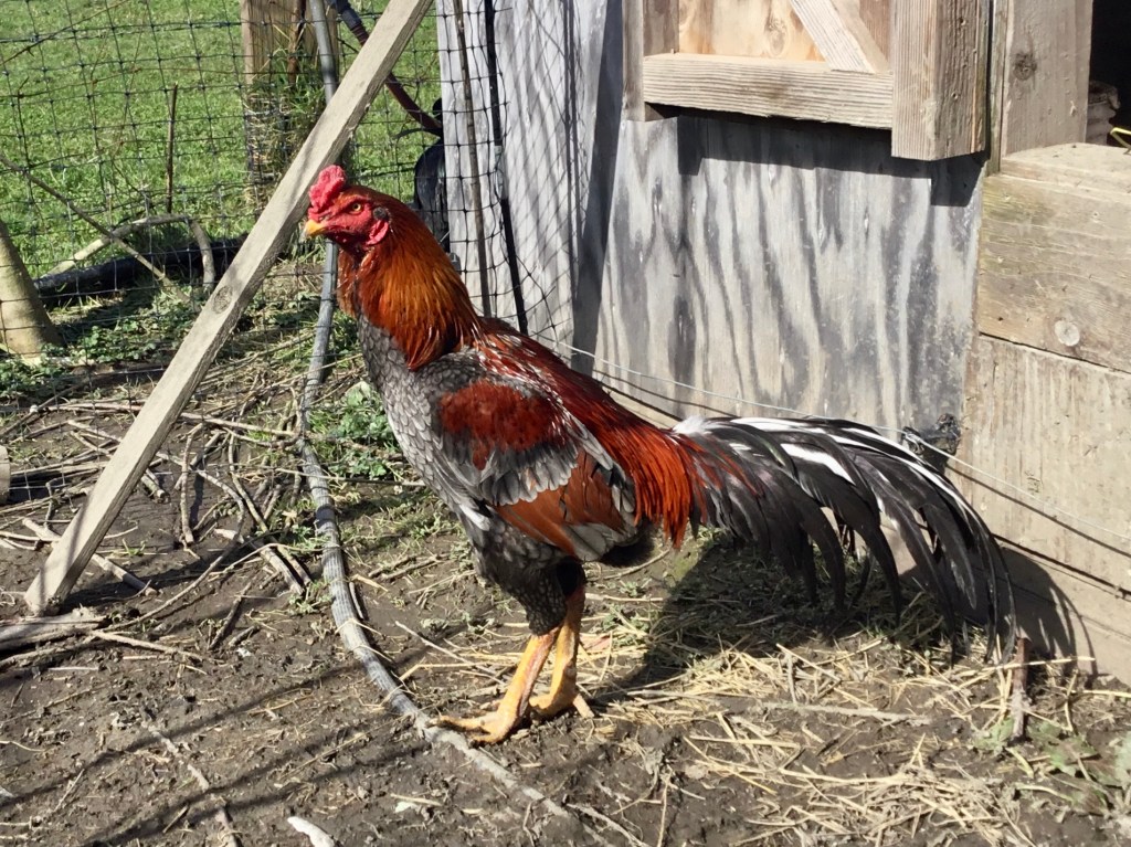 Hmong-Thai in above photyos is 7# 4oz. Just started crowing, still growing fer shur. Great Grandson of Canelo. Grandson of Noob Qes Loj and grandson of Koa Khoau. Son of Zaj Dawb and Robinia. This undiluted Hmoob qaib thaib is a decent Red-Pumpkin and paired with one of my laced brown-pumpkin hens; Offspring mostly in pumpkin, black, yellow and – in this family – occasionally white ( like his dad ).