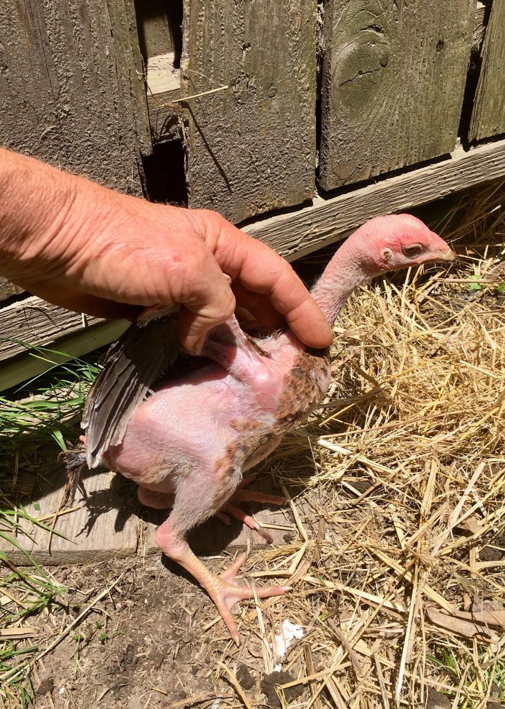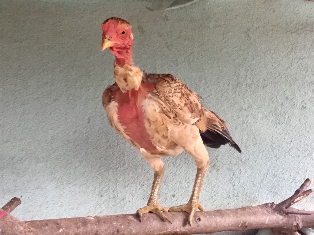Hannah Myriam, above, is here c. 1 1/2years old. A proven good mom, she has reared her chicks. At c. 3 1/2 pounds, she is one of my smaller naked-neck Madagascar girls. From my more relatively pure Madagascar which tend to be smaller birds. We are crossing with heavy GaNoi to create some larger NakedNeck Ganoi. Myriam went to Texas.